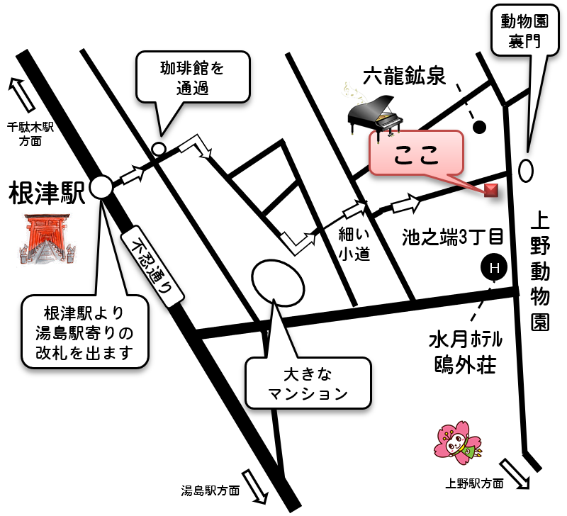 上野動物園裏門を目印に駅より向かうとわかりやすいです。路地に入り総合建物という会社が見えますので、そちらの並びに看板が見えます。